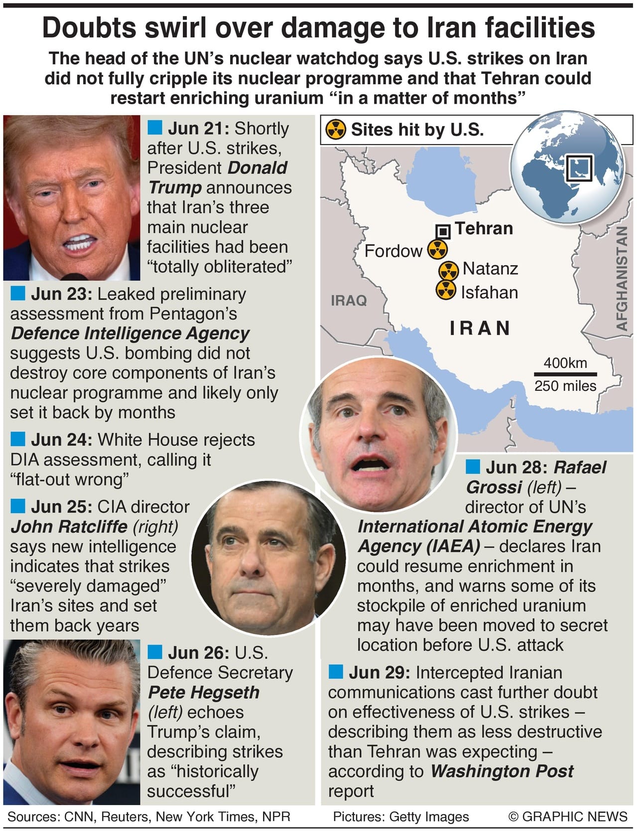 Rafael Grossi’s comments contradict President Donald Trump’s claims that the U.S. set Iran’s ambitions back by decades, and appear to support an early assessment from the Pentagon’s Defense Intelligence Agency, which suggests the strikes did not destroy the core components of Tehran’s nuclear program.