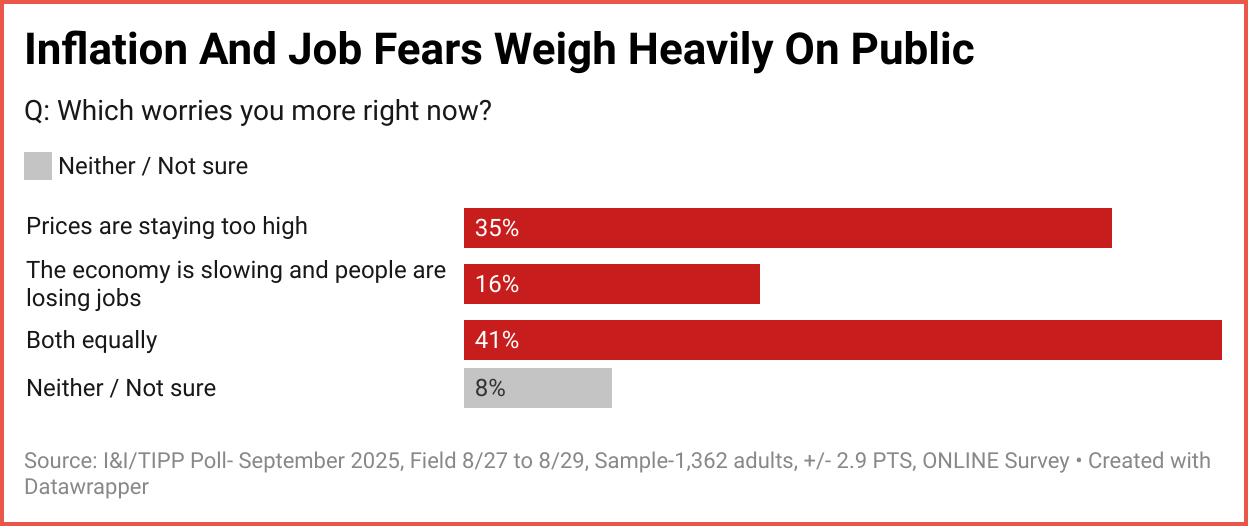I&I/TIPP asked Americans another question related to their economic concerns: "Which worries you more right now?" That question was followed by four possible responses: "Prices are staying too high" (35%), "The economy is slowing and people are losing jobs" (16%), "Both equally" (41%) and "neither/not sure" (8%).