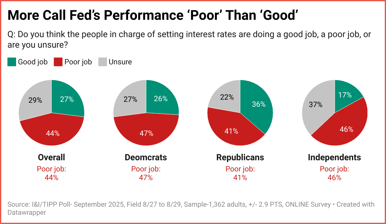 For a third and final question that bears specifically on the Fed's performance, I&I/TIPP asked: "Do you think the people in charge of setting interest rates are doing a good job, a poor job, or are you unsure?"