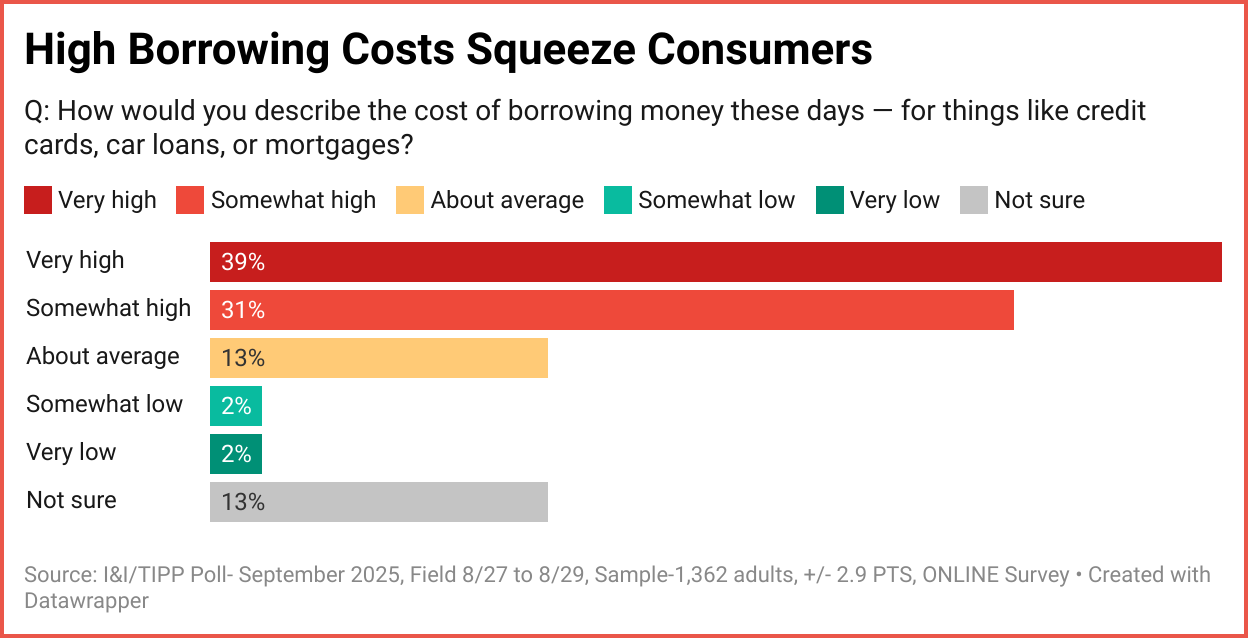In the latest online national I&I/TIPP Poll, taken from Aug. 27-29, 1,362 adults were asked the following question: "How would you describe the cost of borrowing money these days — for things like credit cards, car loans, or mortgages?"