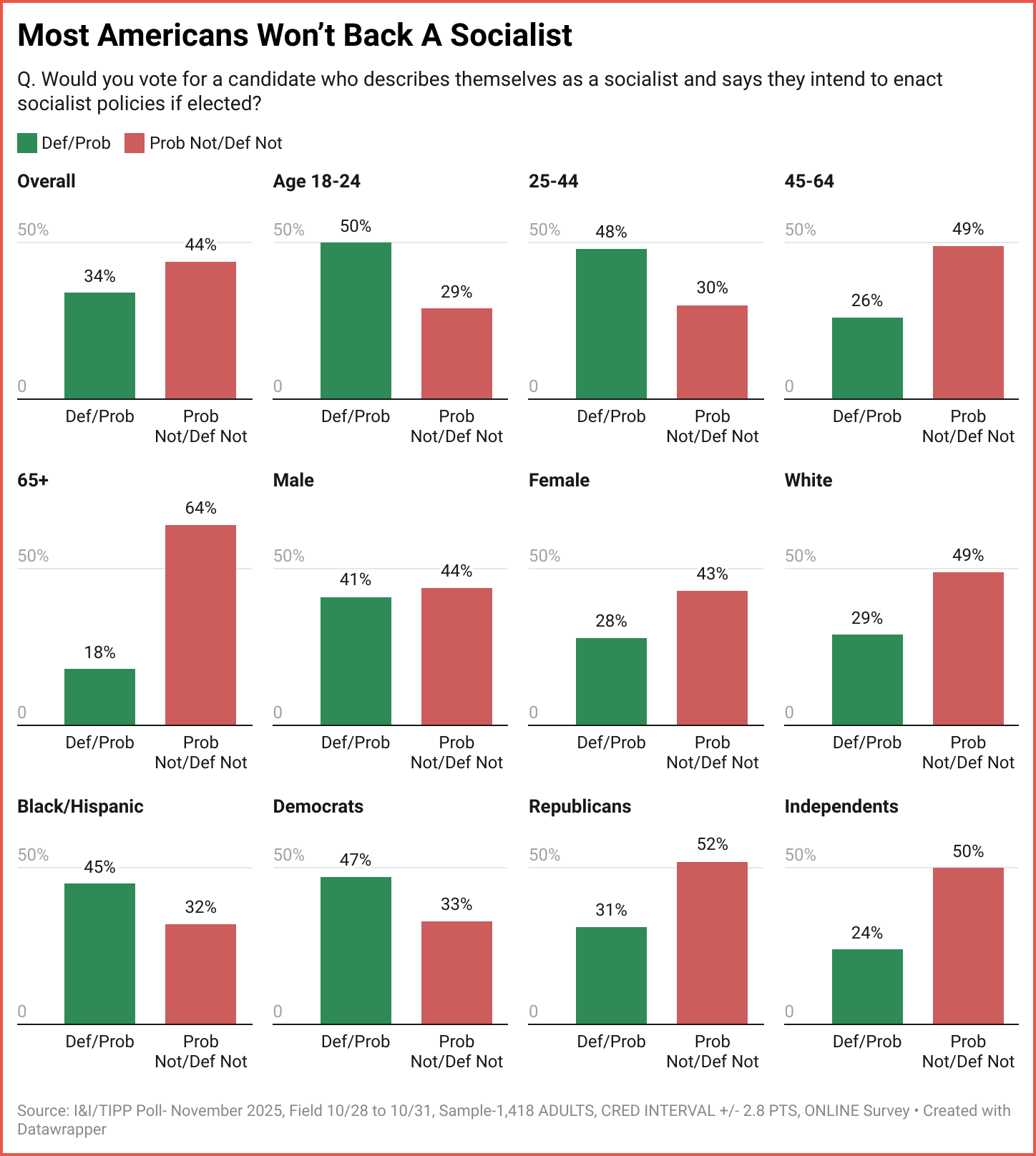 A second I&I/TIPP question asked about actual voting: "Would you vote for a candidate who describes themselves as a socialist and says they intend to enact socialist policies if elected?"