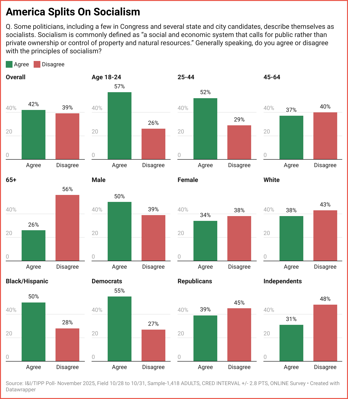 Specifically, I&I/TIPP asked: "Socialism is commonly defined as 'a social and economic system that calls for public rather than private ownership or control of property and natural resources.' Generally speaking, do you agree or disagree with the principles of socialism?"