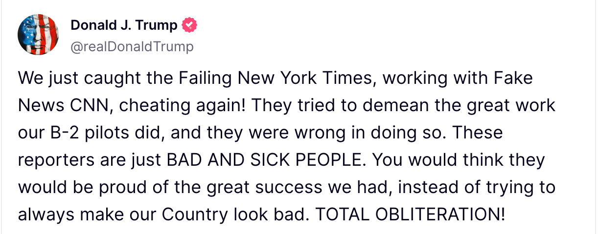 “President Trump has obliterated the Iranian nuclear program,” he wrote. “The American media seems destined to obliterate their own credibility.”