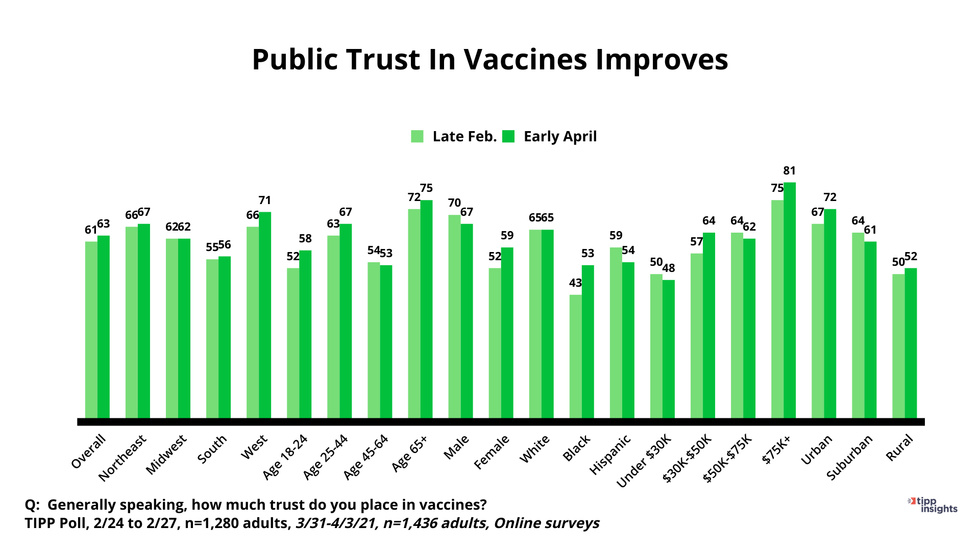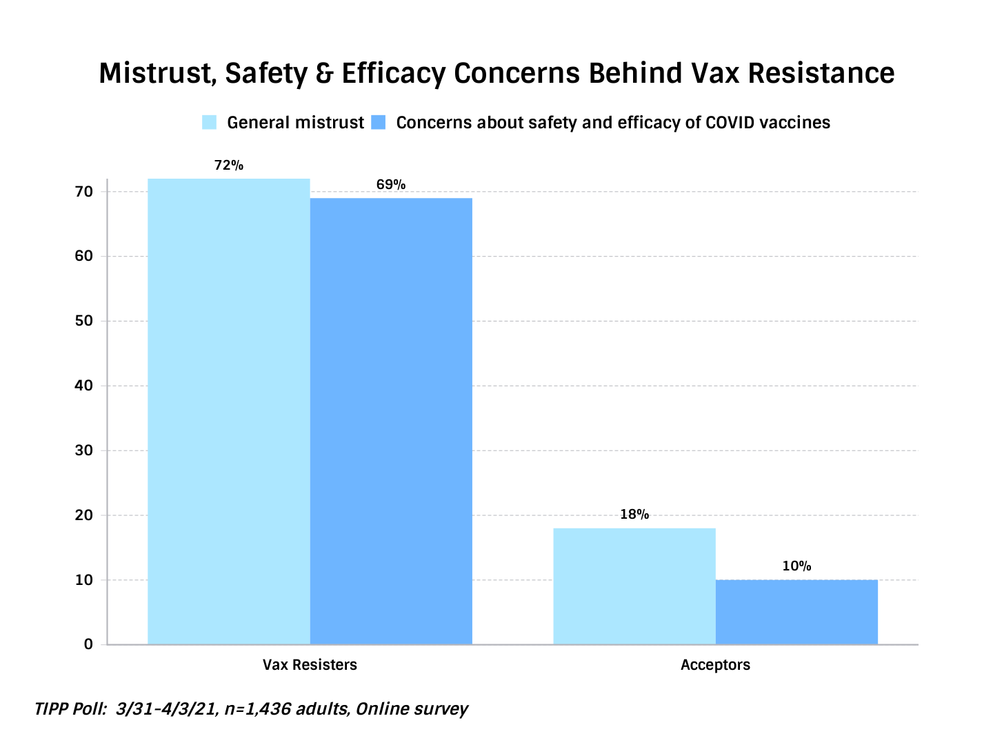 Seventy-two percent of vax resisters in our TIPP Poll conducted in early April have a general mistrust of vaccines, compared to only 18% of acceptors. Furthermore, 69% of vax resisters are skeptical of coronavirus vaccine safety and efficacy, compared to 10% of acceptors.