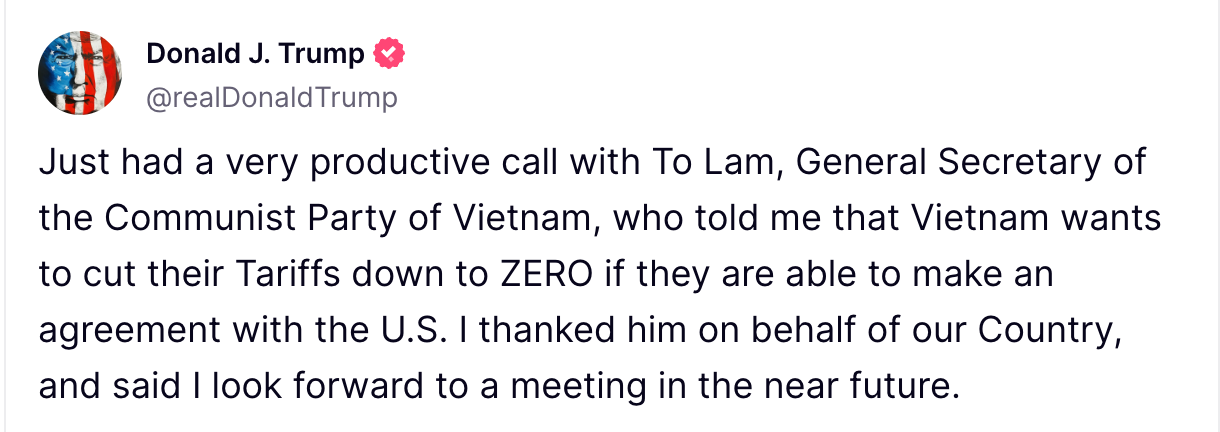 According to details shared by Trump on Truth Social, he had a productive conversation with Vietnam’s General Secretary, To Lam, who expressed a desire to reduce tariffs to zero if an agreement is reached between both countries. Trump indicated plans for an upcoming meeting to discuss further terms as well.
