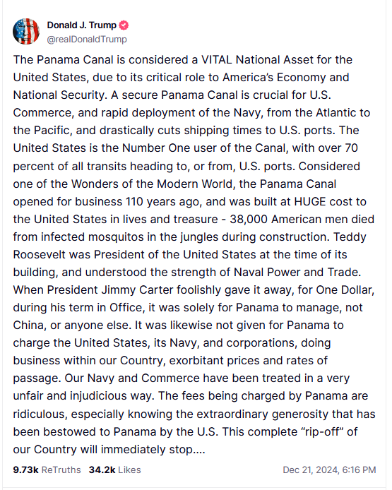 “The fees being charged by Panama are ridiculous, especially knowing the extraordinary generosity that has been bestowed to Panama by the U.S. This complete “rip-off” of our Country will immediately stop,” he wrote, also calling the canal a “VITAL national asset.”