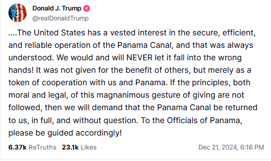 President-elect Trump warned Panama that the U.S. would demand the canal be returned to America if Panama did not stop charging exorbitant fees to use it in a Saturday night Truth Social post.