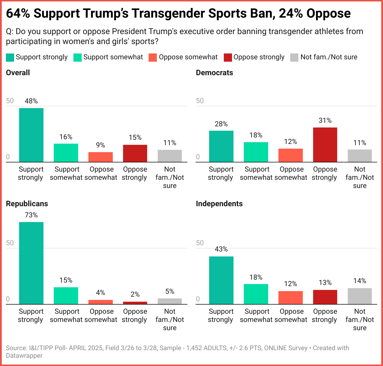 In the most recent national online I&I/TIPP poll, taken from Mar. 26-Mar. 28, 1,452 adults were asked: “Do you support or oppose President Trump’s executive order banning transgender athletes from participating in women’s and girls’ sports?”