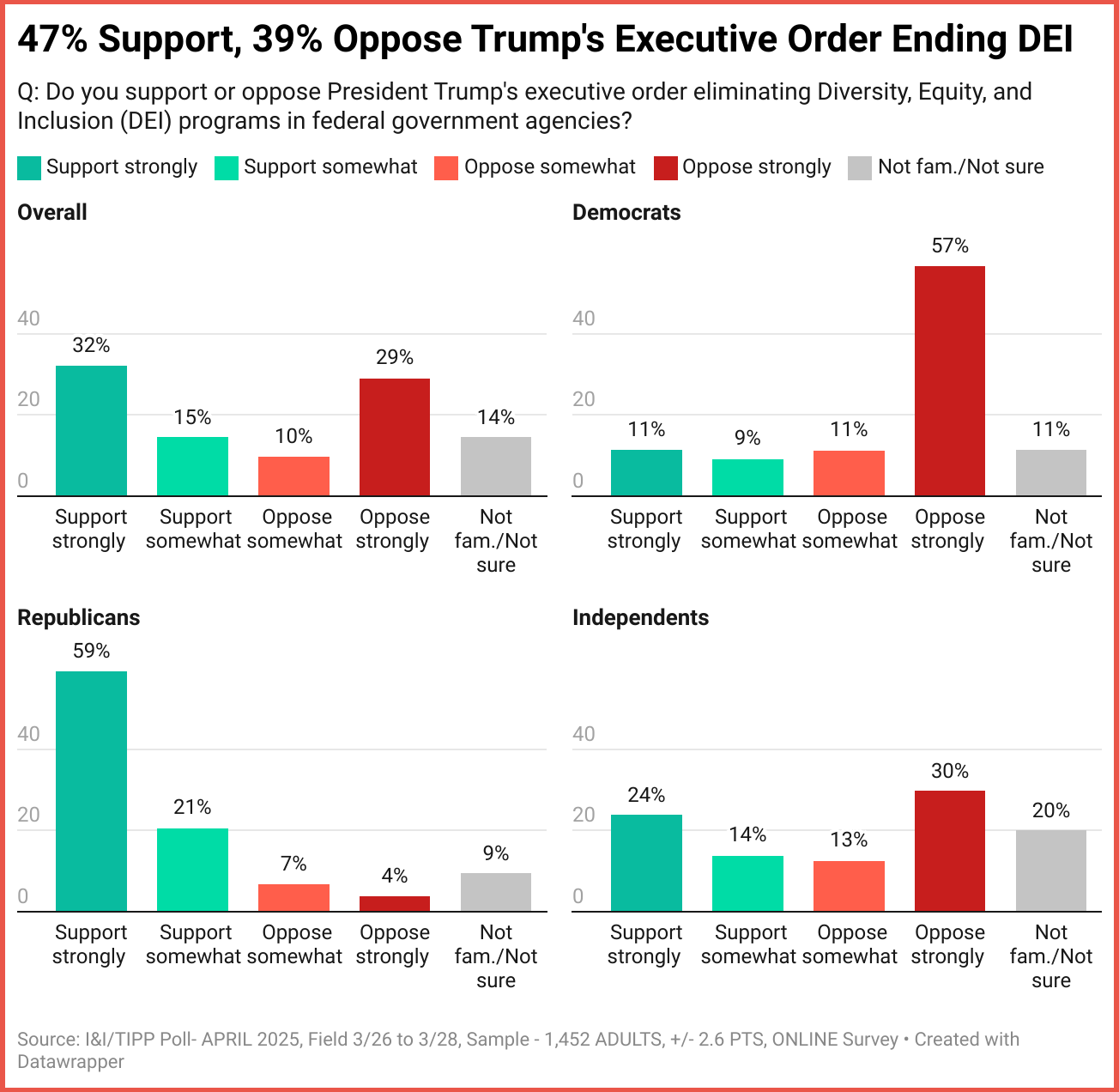 That wasn’t the only executive order by Trump involving race, gender, or sexual identity. I&I/TIPP followed up with this question: “Do you support or oppose President Trump’s executive order eliminating diversity, equity, and inclusion (DEI) programs in federal government agencies?”