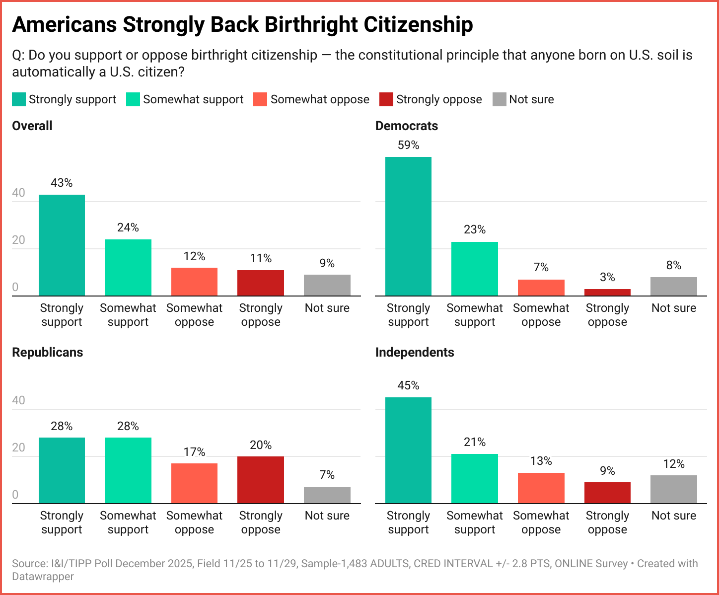 The online national I&I/TIPP Poll, taken from Nov. 25 to Nov. 29 by 1,483 adults, asked Americans a general question: “Do you support or oppose birthright citizenship — the constitutional principle that anyone born on U.S. soil is automatically a U.S. citizen?”