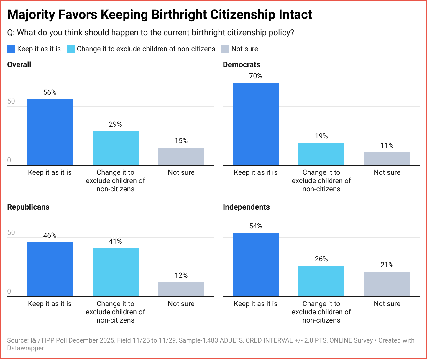 I&I/TIPP asked a follow-up question: “What do you think should happen to the current birthright citizenship policy?” Answer choices included: “Keep it as it is”; “Change it to exclude children of non-citizens”; and “Not sure.”