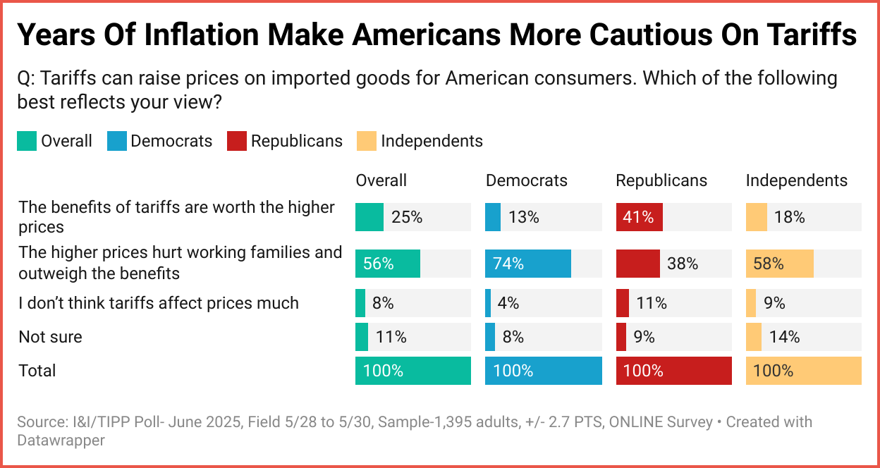 Only 25% agreed that “The benefits of tariffs are worth the higher prices,” while a solid majority of 56% sided with “The higher prices hurt working families and outweigh the benefits.” Just 8% answered “I don’t think tariffs affect prices much,” and 11% were not sure.