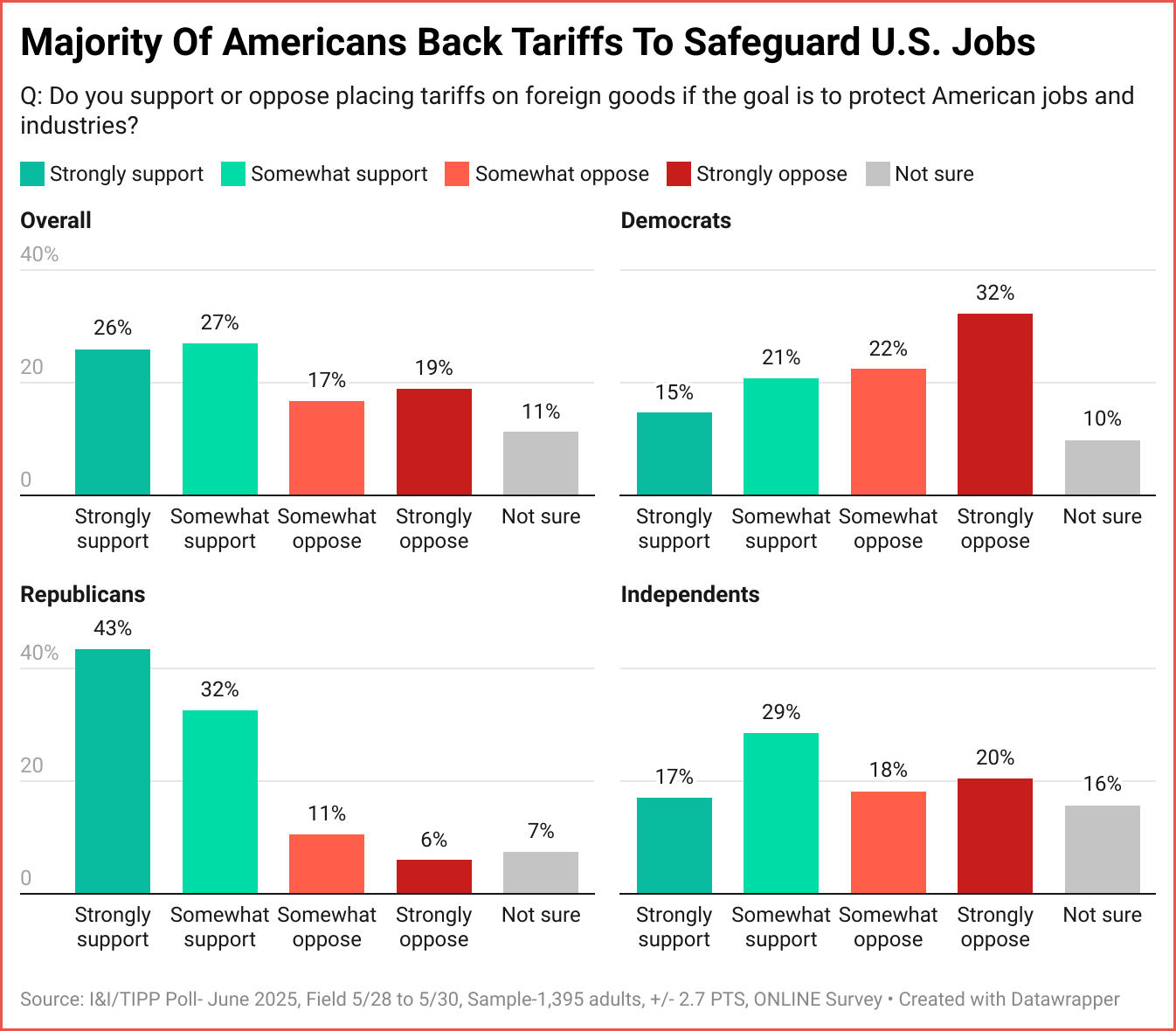 Democrats showed only mild backing (36% support, 54% oppose) for tariffs to protect jobs and industries, compared to stronger backing from Republicans (75% support, 17% oppose) and independents (46% support, 38% oppose).