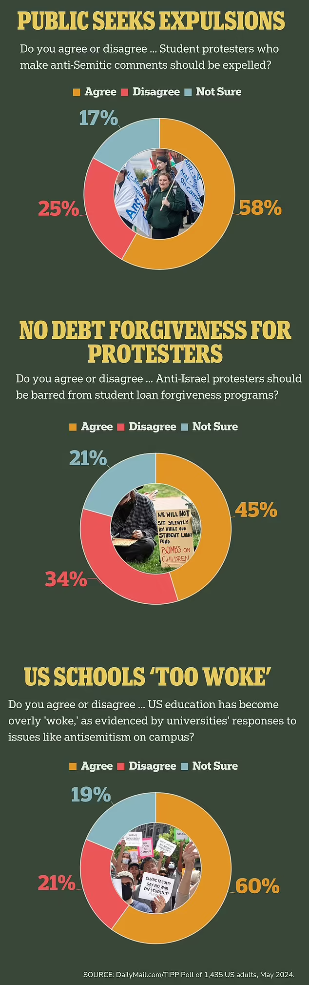 Six-in-ten respondents said students should be kicked out for making anti-Semitic comments; and nearly half said anti-Israel protestors should lose out on student loan forgiveness schemes.