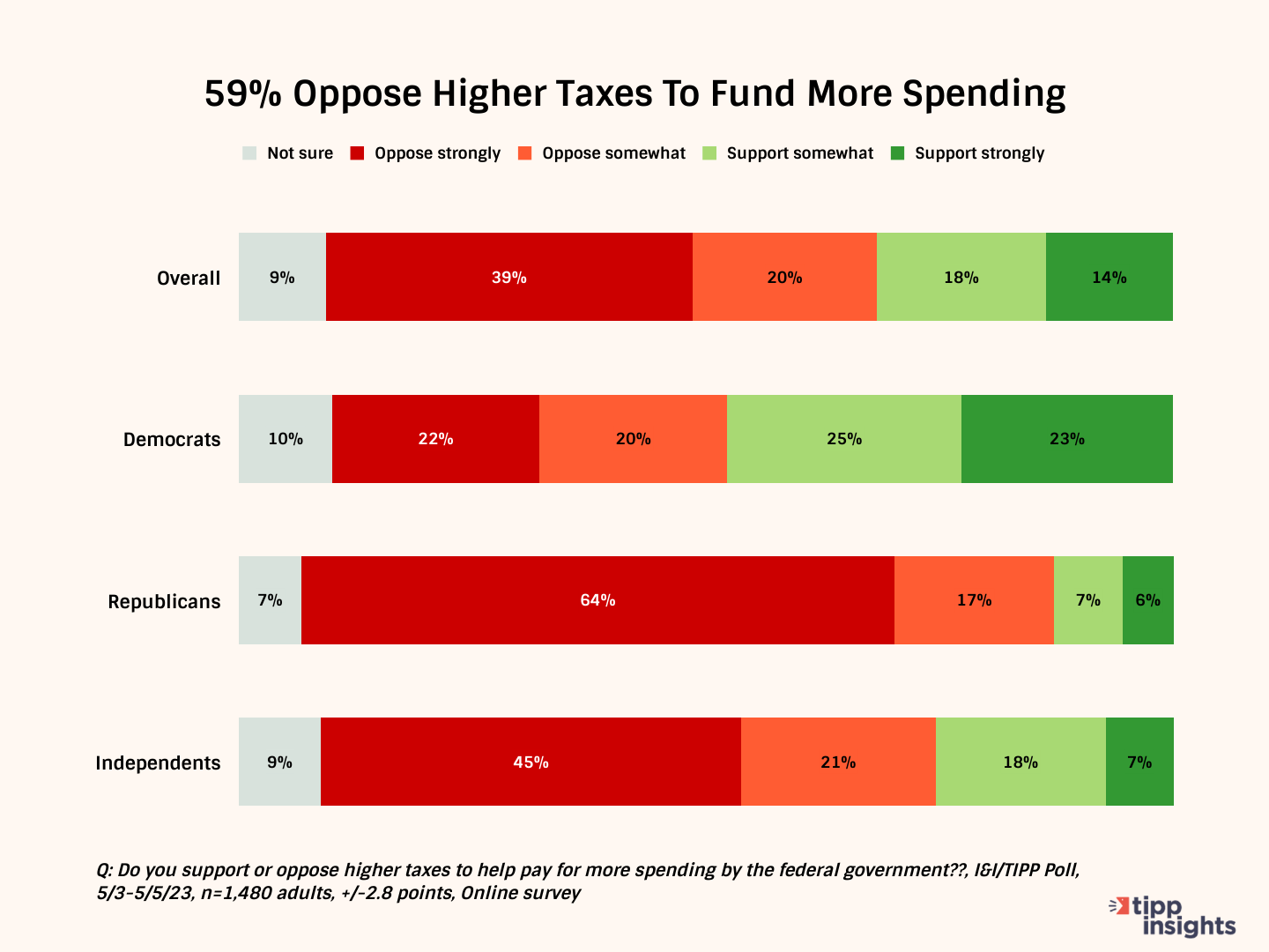 Once again, Americans showed their fiscally conservative side: 59% oppose higher taxes, with 20% saying they opposed them "somewhat" and 39% saying they opposed them "strongly."