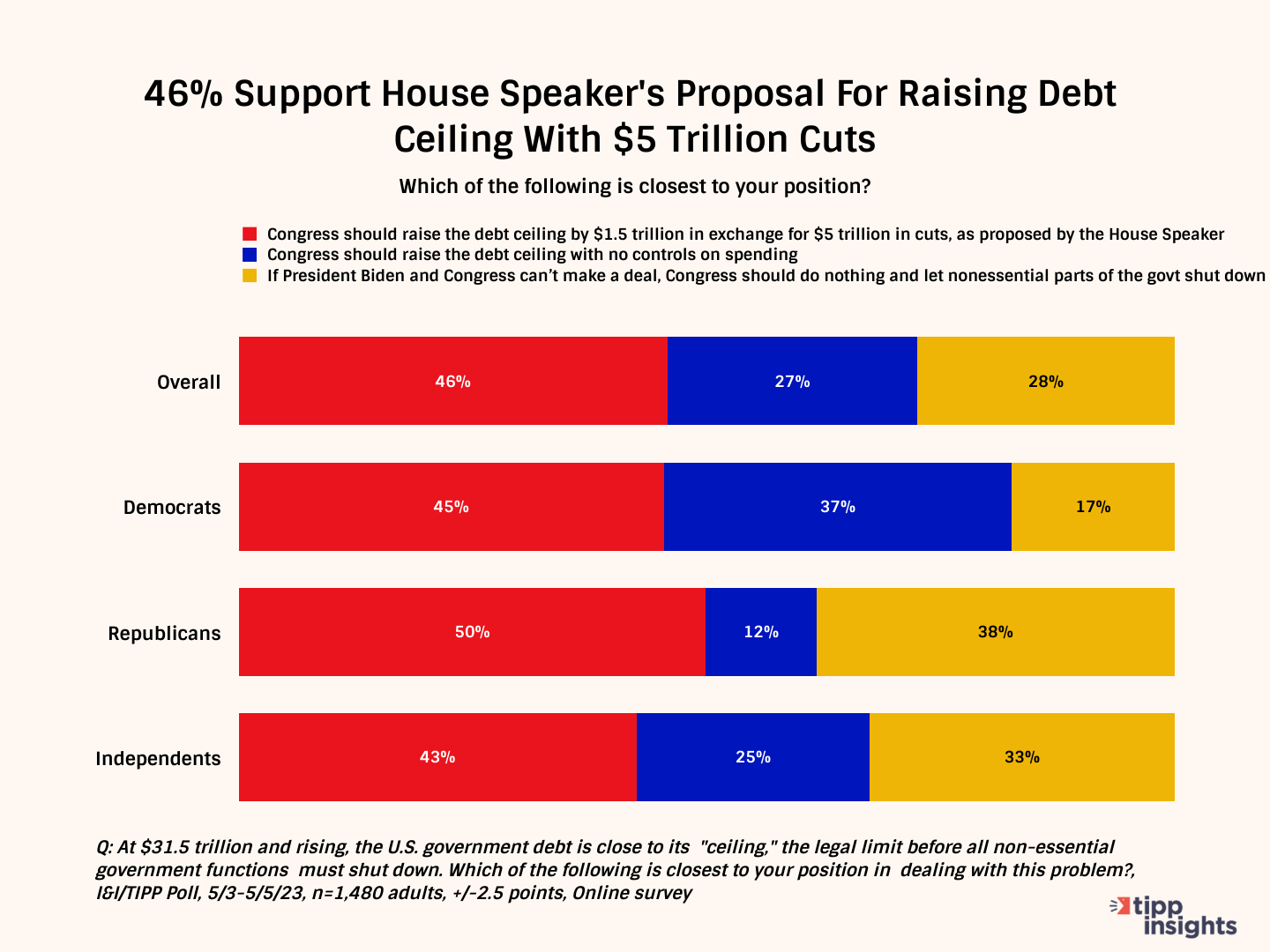 There's always a lot riding on a showdown between a president and Congress over raising the federal debt ceiling to avoid a government shutdown. But this year, as the 2024 election year looms, the stakes are particularly high. That could be bad news for President Joe Biden, the latest I&I/TIPP Poll shows, since his positions on debt, taxes and spending lack majority support even from Democratic voters.