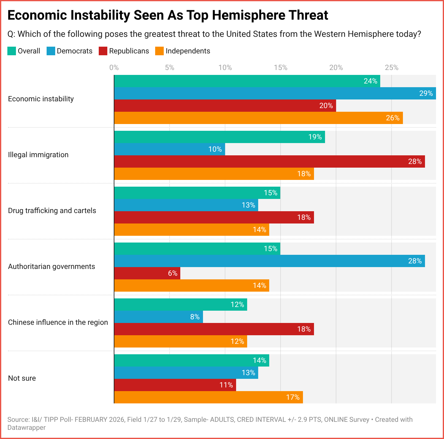 The response: 24% said “economic instability,” 19% “illegal immigration,” 15% “authoritarian governments,” 15% “drug trafficking and cartels,” and 12% “Chinese influence in the region.” Another 14% answered “not sure.”