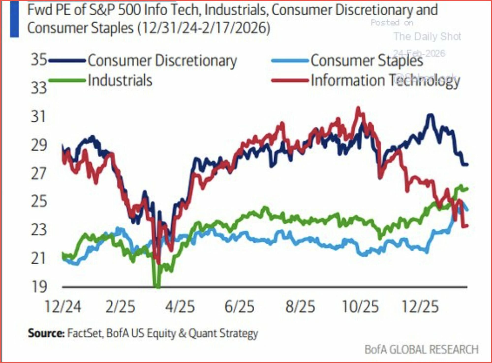 Investors often compare companies using something called a “price-to-earnings ratio,” which shows how expensive a stock is relative to its profits. Right now, big technology companies are trading at lower valuations than consumer staples like food and household goods, and even lower than retail and industrial companies. That is unusual because tech stocks have historically traded at a premium. It suggests investors are cooling on tech growth expectations, at least for now.