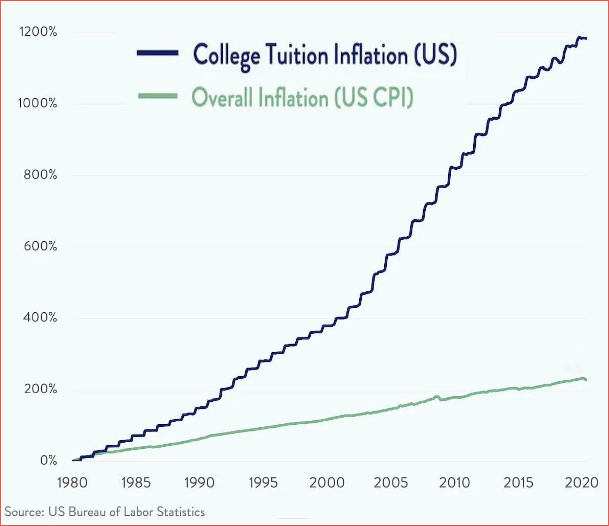 Since 1980, college tuition has increased more than 1,000%, while overall consumer prices have risen only about 200% over the same period. In simple terms, the cost of college has grown many times faster than normal inflation. This helps explain why student debt has ballooned and why families feel squeezed when paying for higher education.