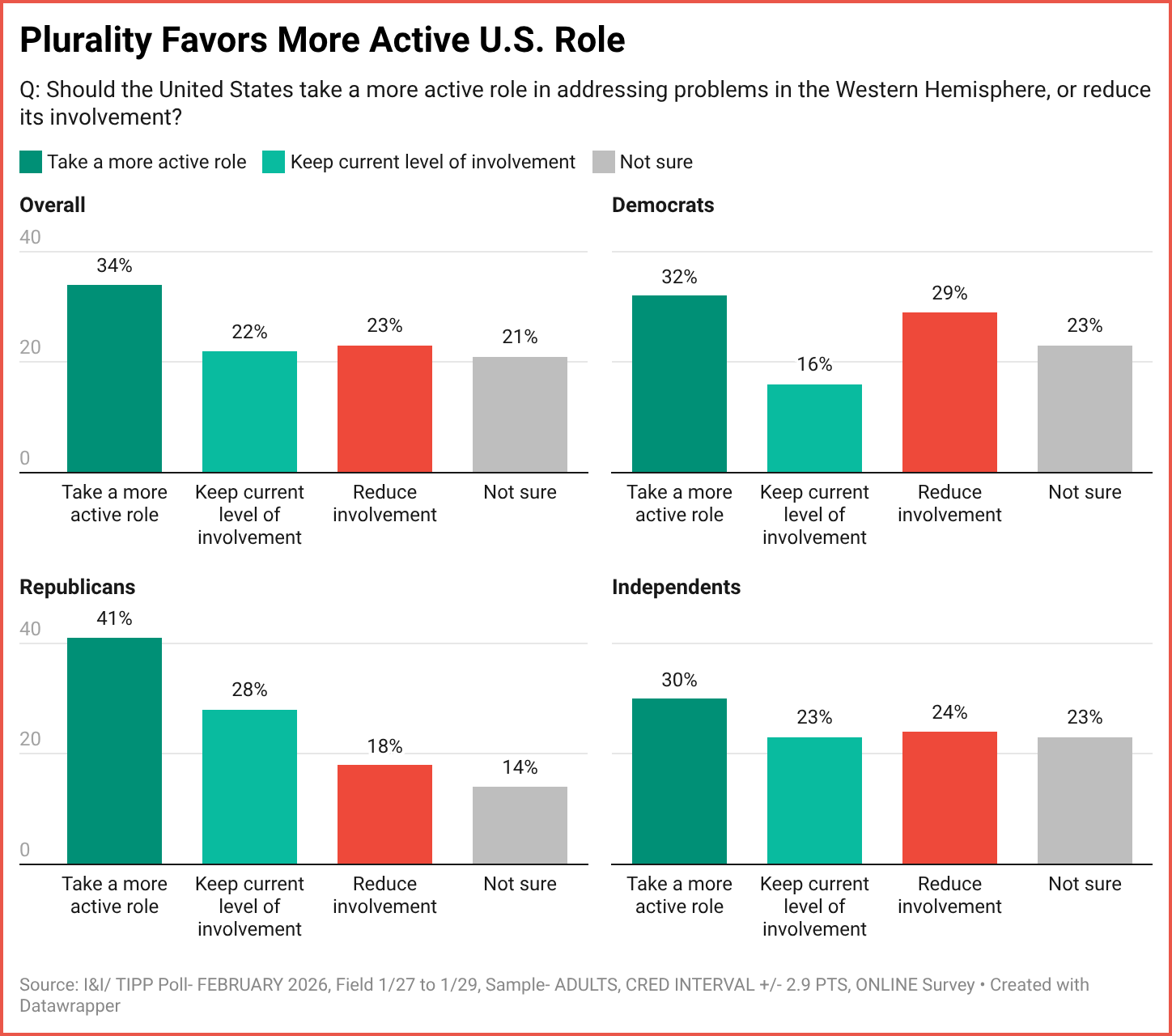 I&I/TIPP asked voters: “Should the United States take a more active role in addressing problems in the Western Hemisphere, or reduce its involvement?”