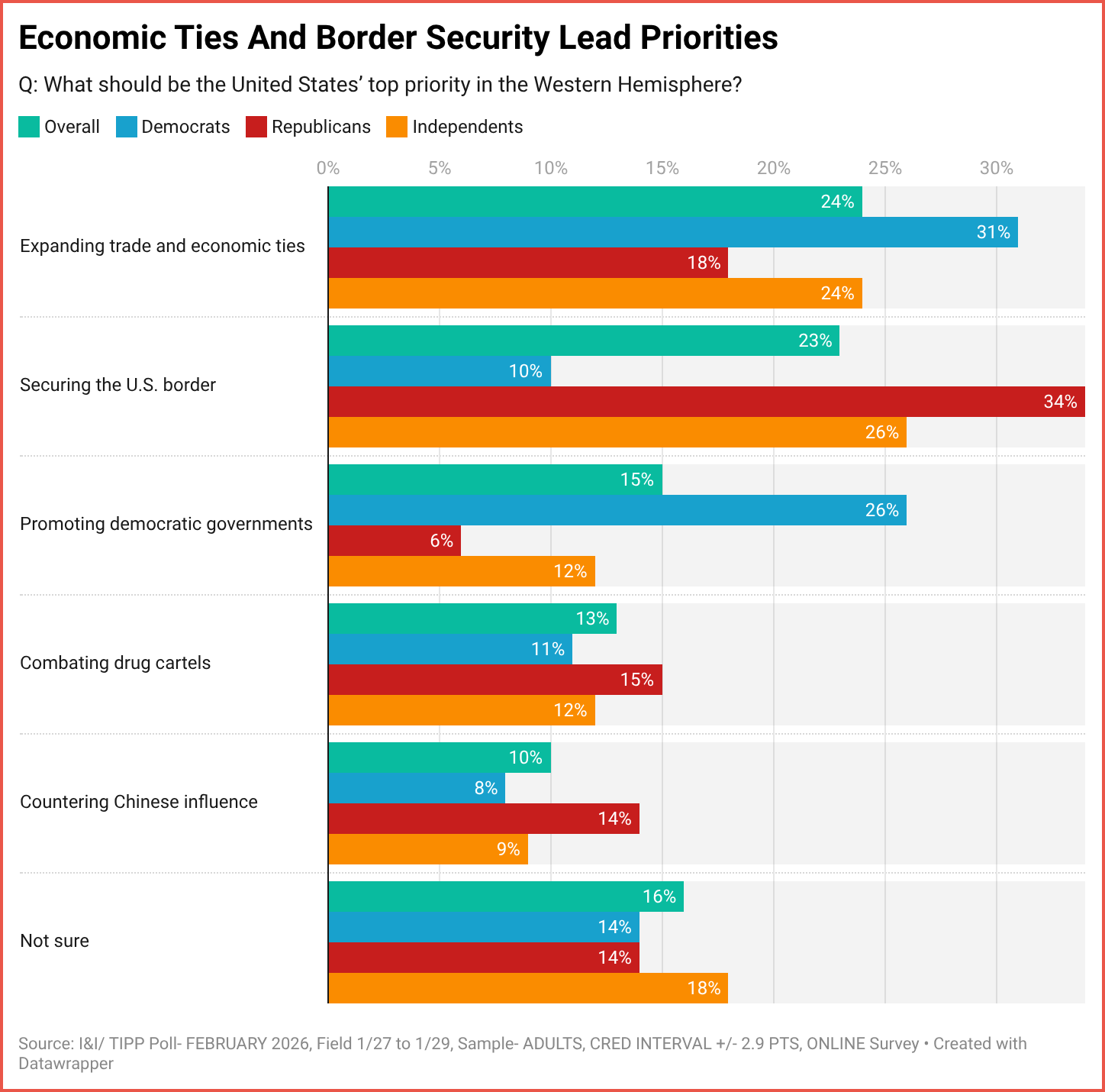 Two answers scored highest overall: “Expanding trade and economic ties” (24%) and “Securing the U.S. border” (23%), a statistical tie. They were followed by “Promoting democratic governments” (15%), “Combating drug cartels” (13%), and “Countering Chinese influence” (10%). Once again, “not sure” was one of the largest responses at 16%.