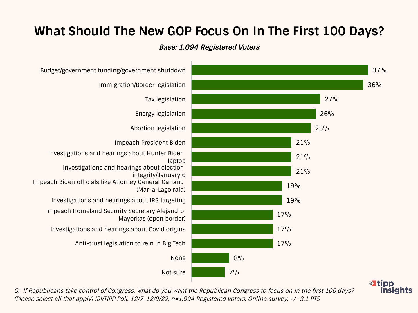The list came from an online Golden/TIPP poll taken from Dec. 7-9 among 1,094 registered voters and having a +/-2.9 percentage point margin of error. It asked voters a simple question: "What do you want the Republican House of Representatives to focus on in the first 100 days?" Respondents were then given 15 possible answers.