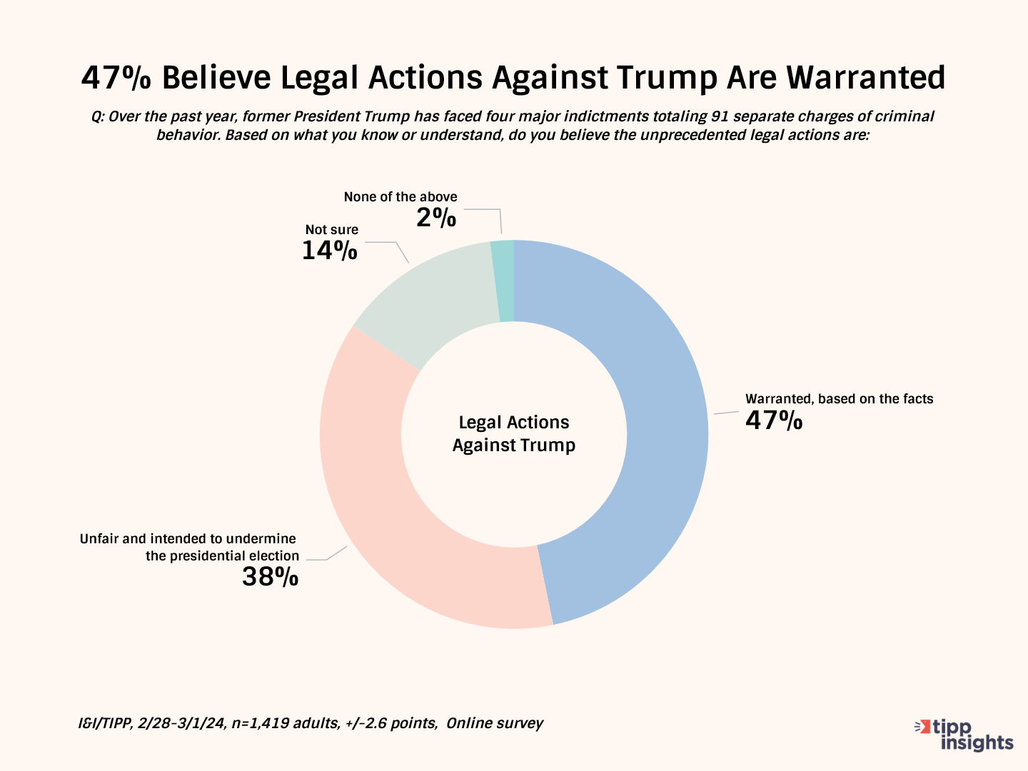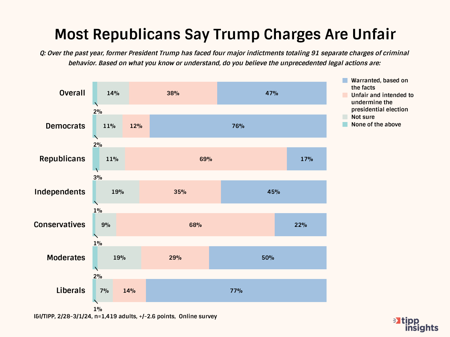 The national online I&I/TIPP Poll, taken from Feb. 28 to March 1, posed the following question to 1,419 registered voters across the nation: "Over the past year, former President Trump has faced four major indictments totaling 91 separate charges of criminal behavior. Based on what you know or understand, do you believe the unprecedented legal actions are..."