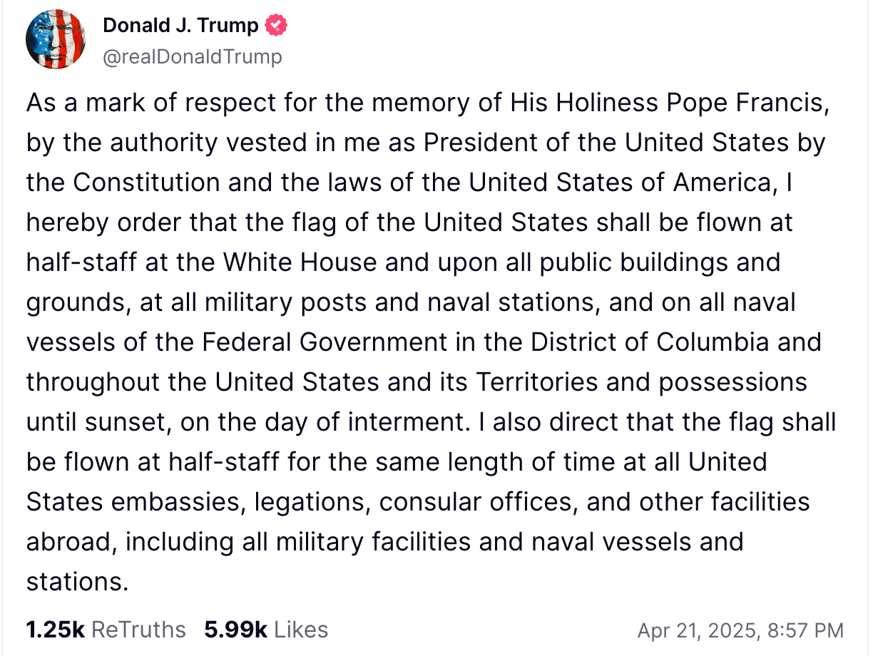 He credited First Lady Melania Trump for organizing the event and emphasized a broader revival underway. “We’re bringing a lot of things back,” he said, “but we’re bringing religion back.” The president closed with a cheerful “Happy Easter” and promised, “We’re going to have a great four years.” He also announced flags would fly at half-mast for Pope Francis, calling him “a good man” who “loved the world.”
