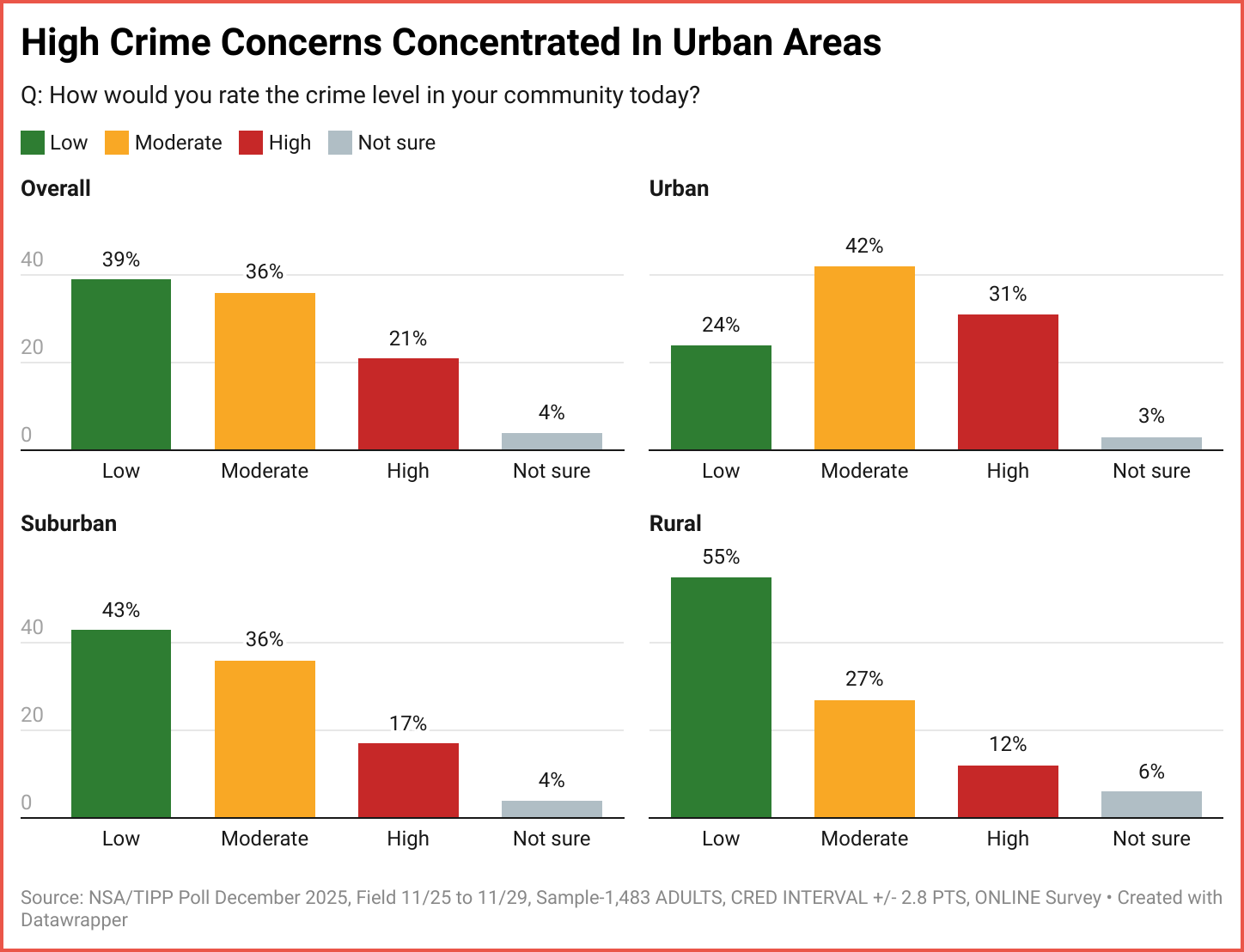 This polling underscores a hard truth many families already live with: crime concerns are highest in urban communities, where nearly one in three residents now rate crime as “high.” These are the same communities most harmed by the failed push to defund the police—a policy experiment that weakened public safety, demoralized officers, and left neighborhoods more vulnerable. Sheriffs know that safer cities strengthen suburbs and rural America alike. Public safety is not a zero-sum game: investing in law enforcement, accountability, and community policing makes every part of our country stronger, safer, and more resilient.