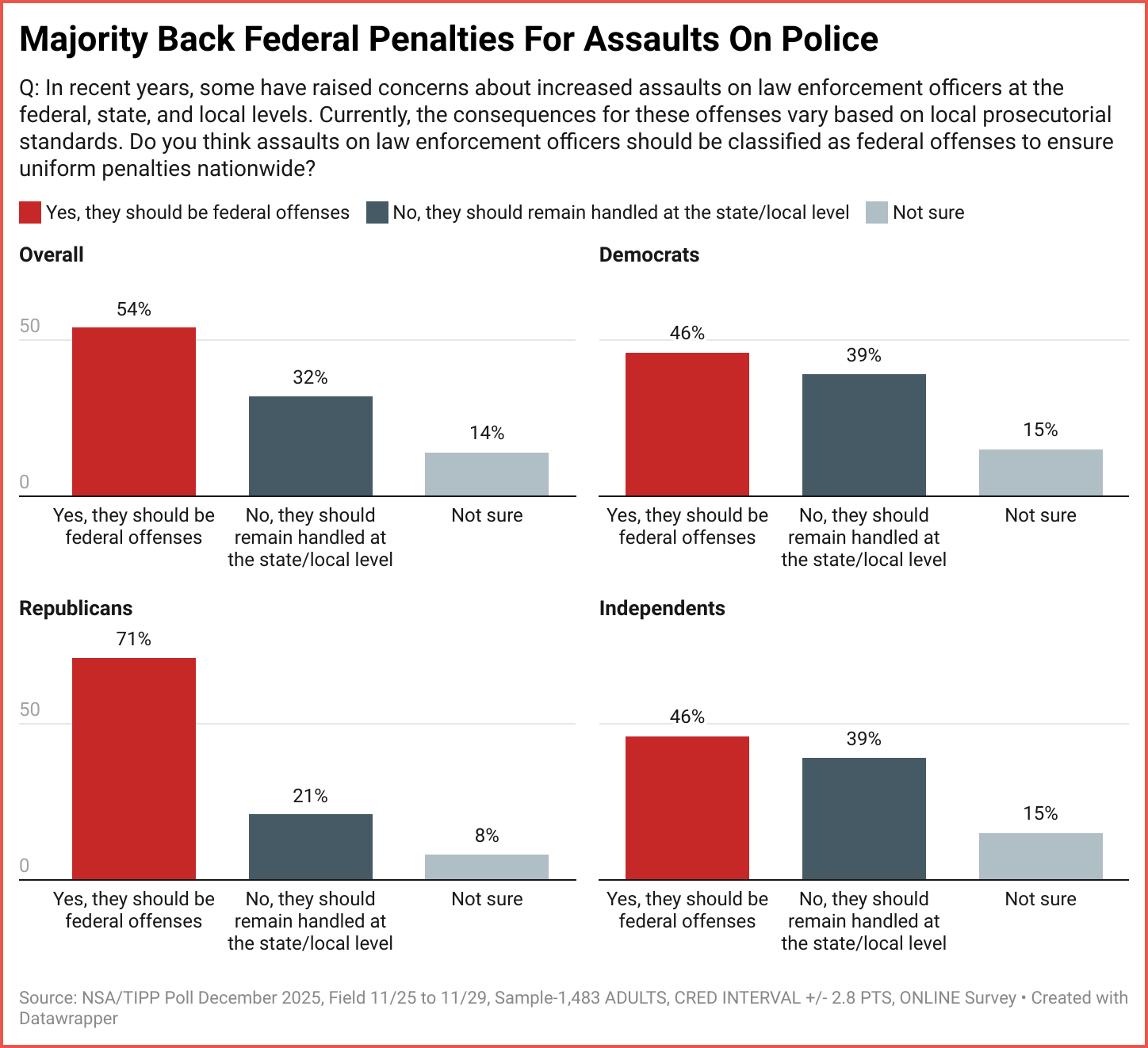 Americans see what is happening and are demanding accountability. New national polling conducted by the National Sheriffs’ Association and TIPP shows that 54% of Americans support classifying assaults on law enforcement officers as federal crimes, ensuring uniform penalties nationwide. Support spans party lines, including 71% of Republicans, 46% of Democrats, and 46% of Independents.
