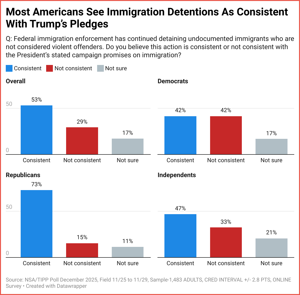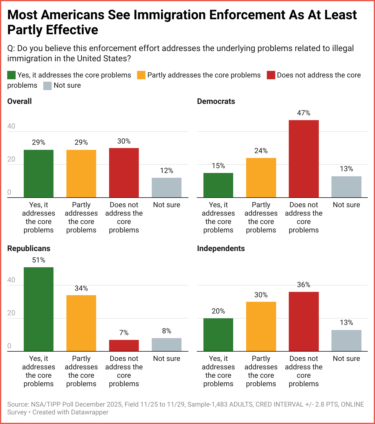 Americans also recognize the importance of effective immigration enforcement as a public-safety tool. According to the survey, 58% of Americans say current immigration enforcement efforts are at least partly effective, including 85% of Republicans, 50% of Independents, and 39% of Democrats.