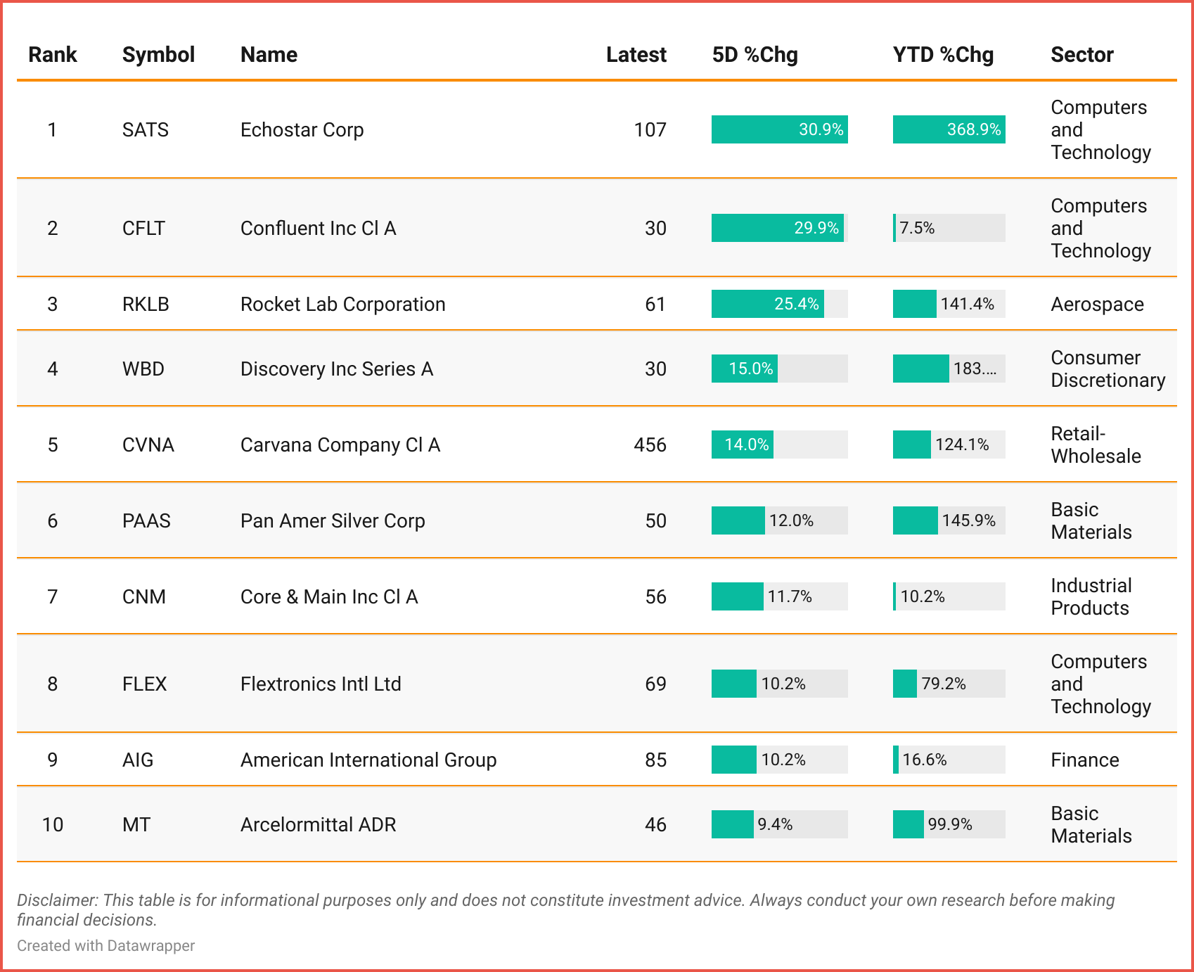 A data-driven look at the week’s 10 best-performing stocks — all trading above $20 with over 1M in volume.