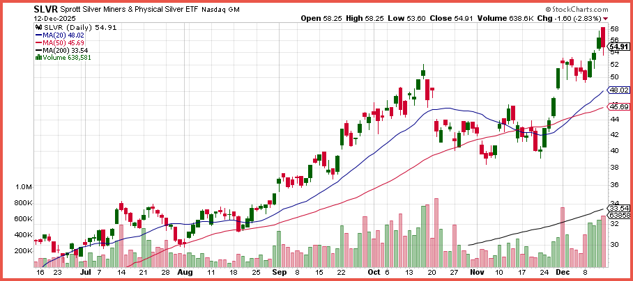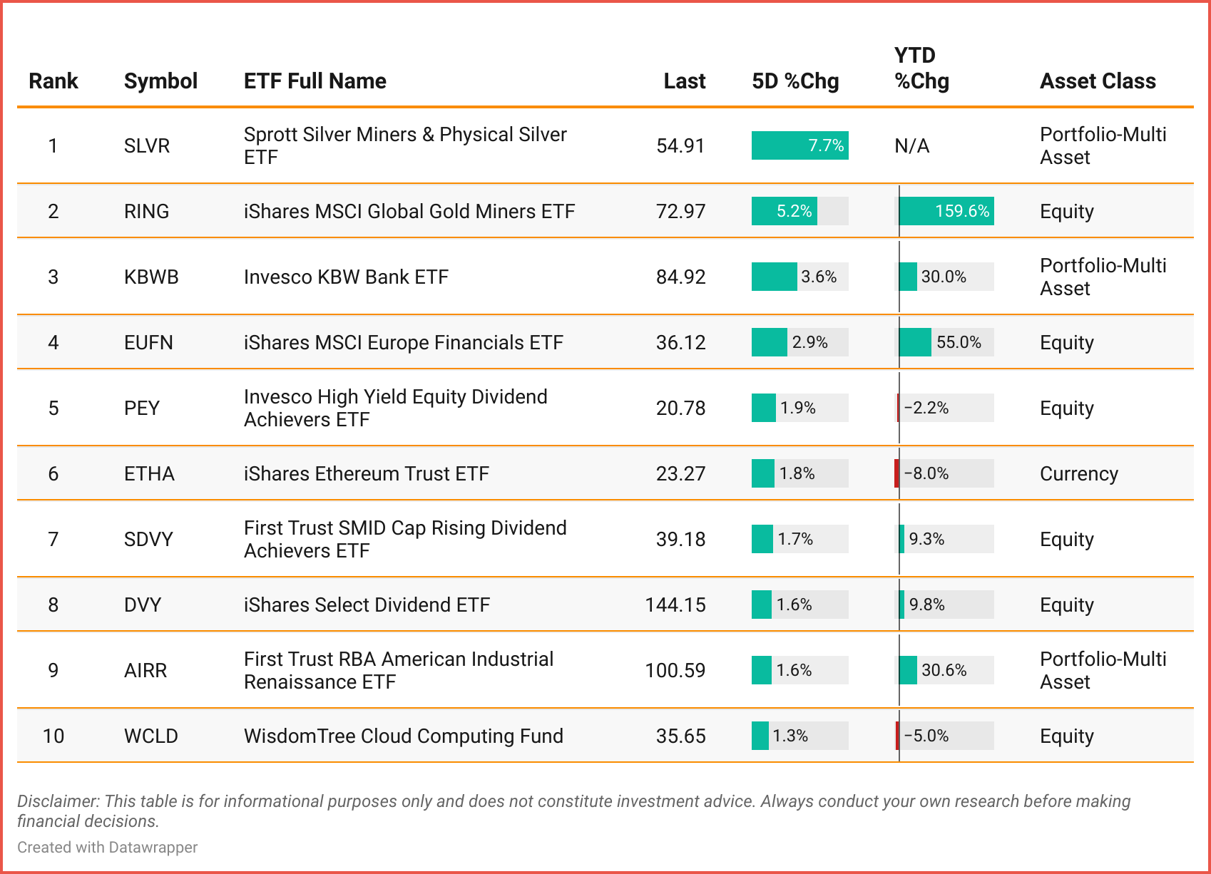 Tickers: SLVR | RING | KBWB | EUFN | PEY | ETHA | SDVY | DVY | AIRR | WCLD