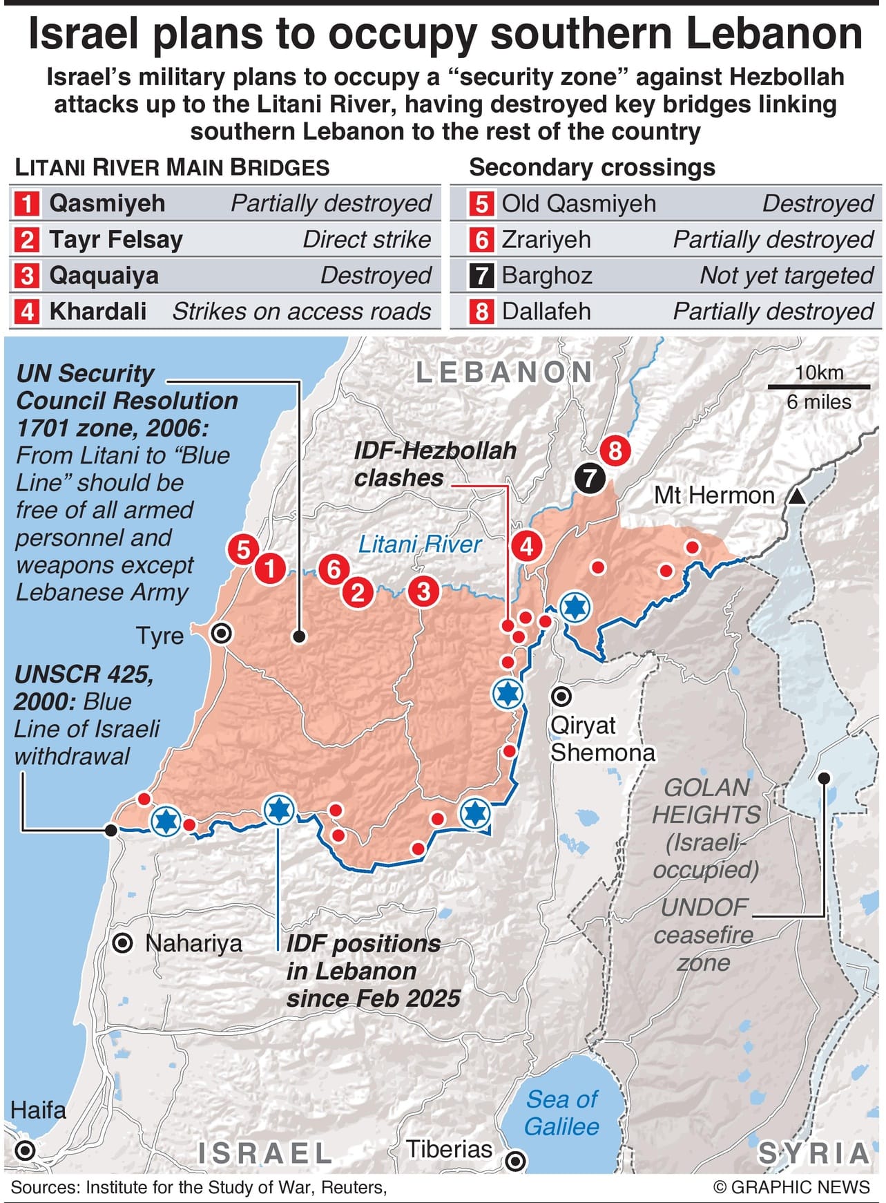 Israel’s military is to occupy a “security zone” against Hezbollah attack up to the Litani River, having destroyed key bridges linking southern Lebanon to the rest of the country.