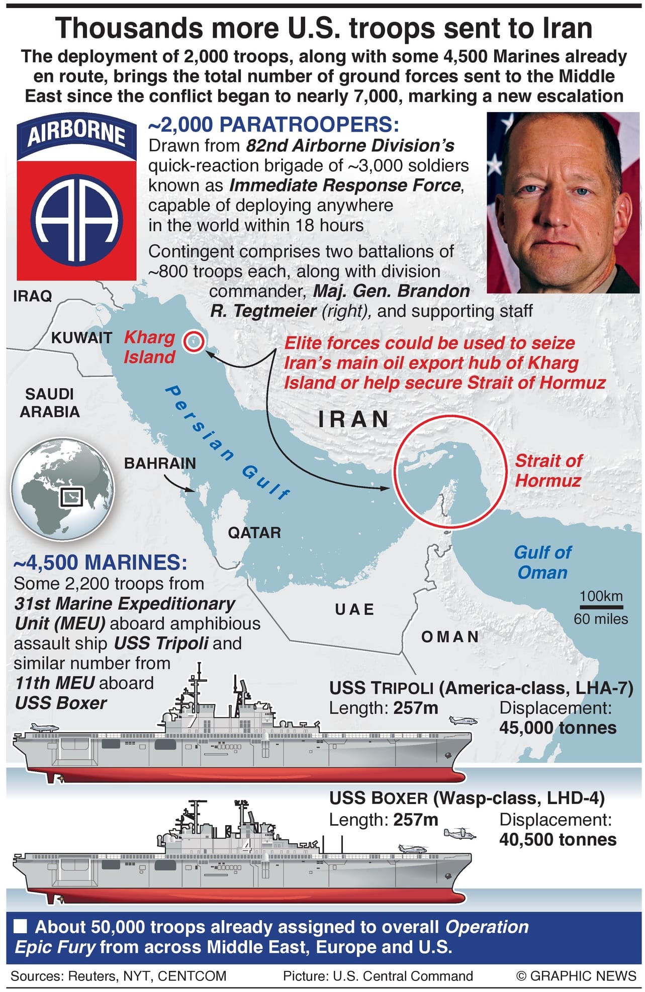 The paratroopers are expected to join several thousand Marines already heading to the region, giving Trump a wider range of military options, including potential operations to secure the Strait of Hormuz or carry out other missions.