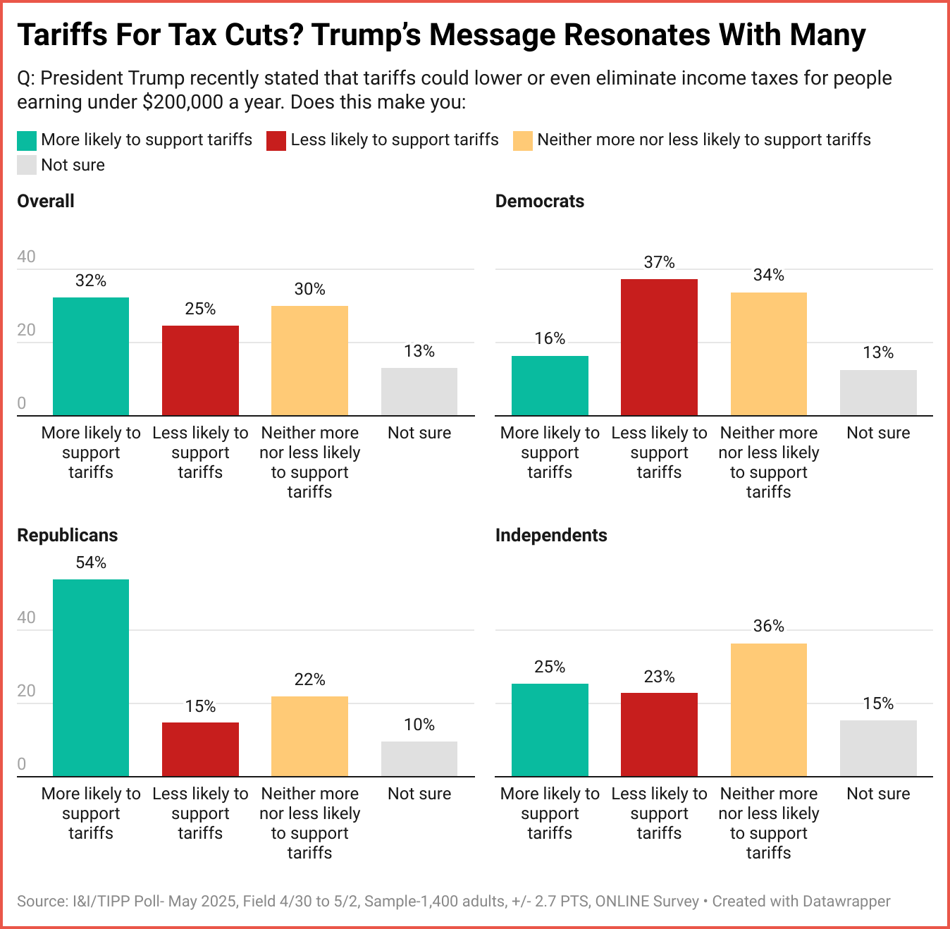 Men and women differ as well, with 38% of men "more likely" to support tariffs with income tax cuts, while only 26% of women say the same. But among the "less likely" answers, the two genders are virtually the same: men 25%, women 24%.