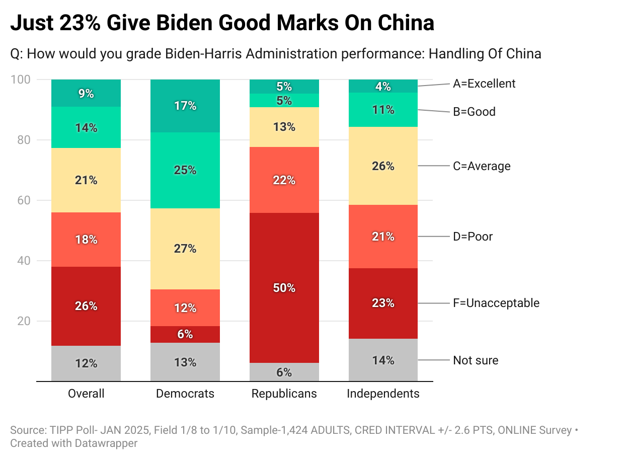 A TIPP Poll conducted this month reveals that only 23% of Americans rated former President Biden's handling of China favorably, with a majority assessing his performance as poor or unacceptable. This widespread dissatisfaction across party lines underscores concerns about the previous administration's approach to U.S.-China relations.