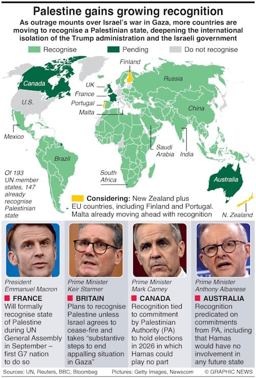 The declaration to recognise a Palestinian state at the UN General Assembly in September follows similar moves by the UK, France, and Canada.