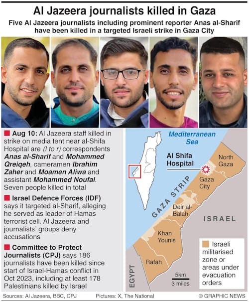 The Israel Defence Forces (IDF) confirmed it had targeted Anas al-Sharif, alleging that he had “served as the head of a terrorist cell in Hamas”. The Committee to Protect Journalists (CPJ) said it was appalled by the attack and that Israel had failed to provide evidence to back up its allegations against al-Sharif, according to the BBC.