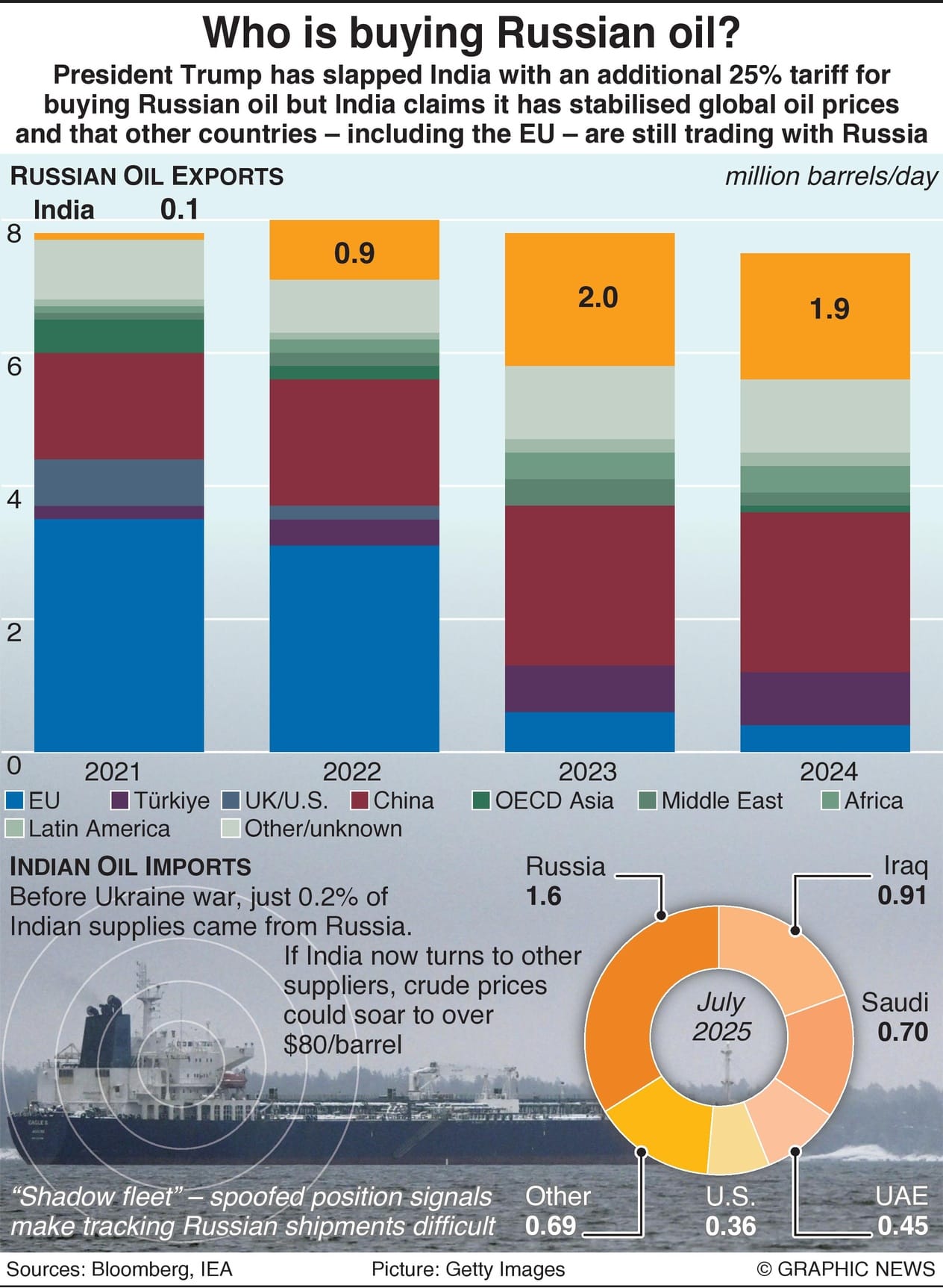 President Trump has slapped India with an additional 25% tariff for buying Russian oil, but India claims it has stabilized global oil prices and that other countries, including the EU, are still trading with Russia.