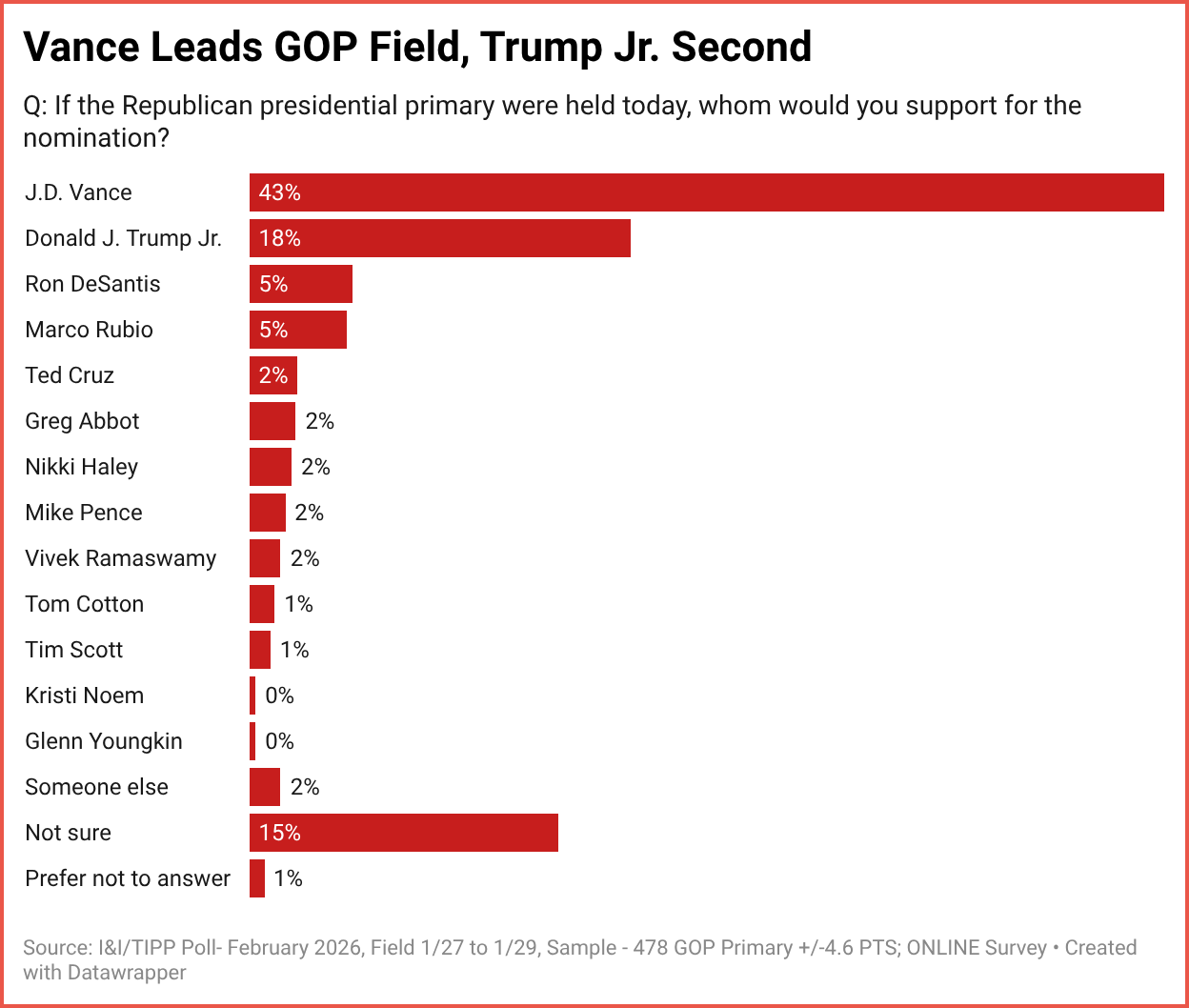 Among the 478 Republican primary voters, the 2028 presidential favorites include Vice President J.D. Vance (43%), Donald Trump Jr. (18%), Florida Gov. Ron DeSantis and Secretary of State Marco Rubio (5%), and a list of nine others who received 3% or less support.