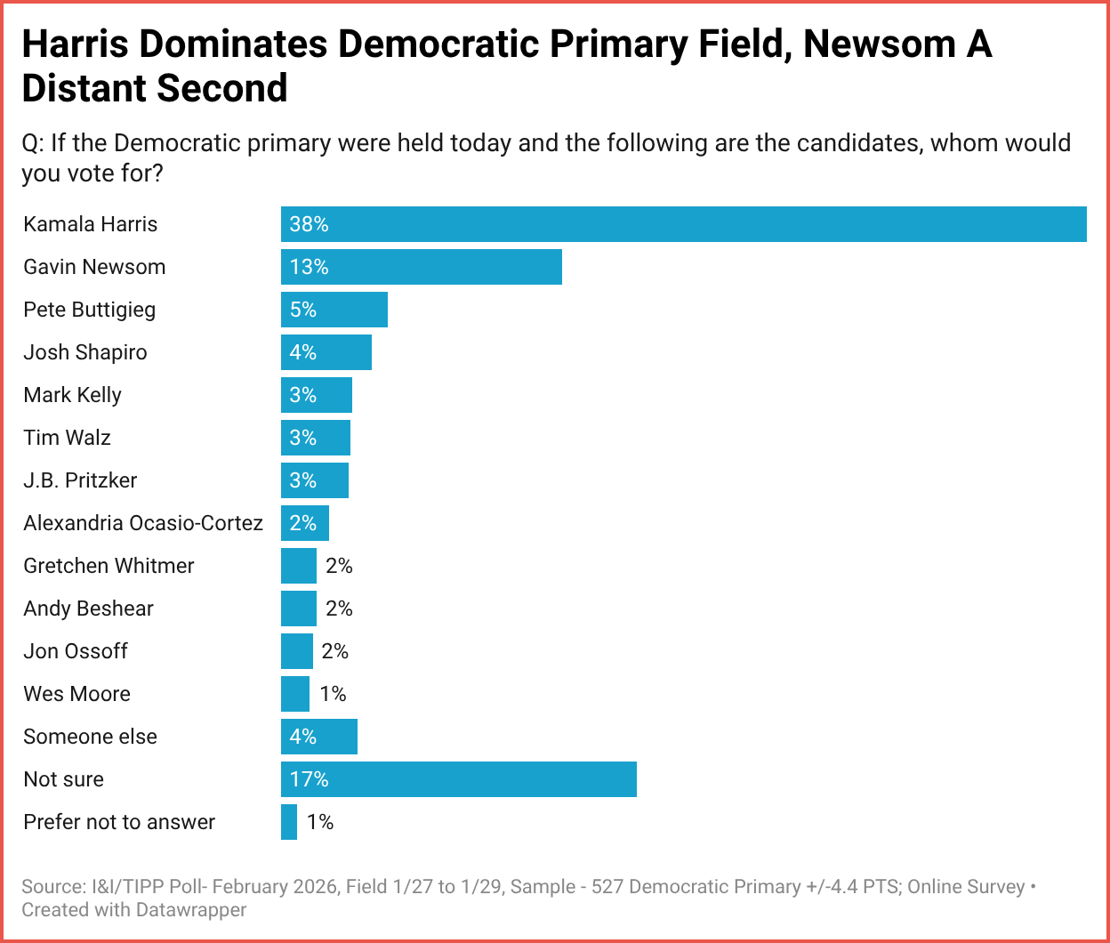 Among the 527 Democratic primary voters, Kamala Harris received 38% of the vote, followed by California Gov. Gavin Newsom (13%), former Transportation Secretary Pete Buttigieg (5%), Pennsylvania Gov. Josh Shapiro (4%) and a long list of others at 3% or less.