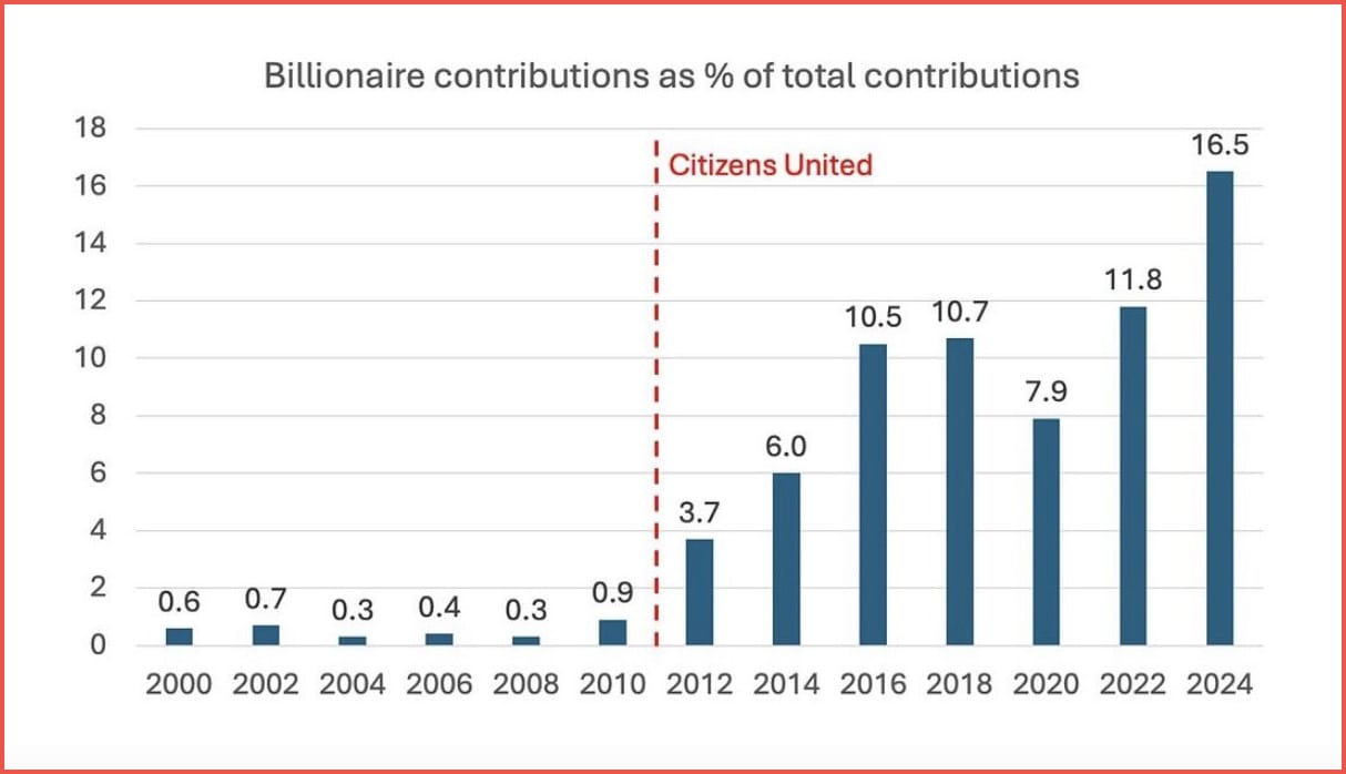 Billionaire contributions as a share of total federal election funding have climbed sharply since 2010, rising from under 1% pre–Citizens United to more than 16% in the 2024 cycle. The trend underscores how concentrated wealth is playing a larger role in campaign finance.