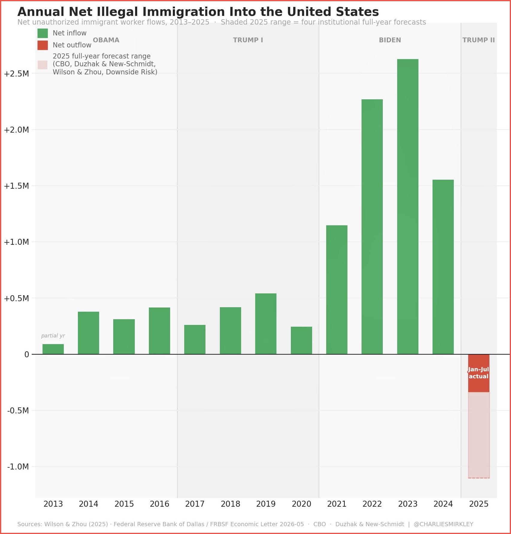 Preliminary estimates show net illegal immigration into the U.S. may have turned negative in 2025, with departures exceeding arrivals in the first half of the year. If sustained, it would mark a sharp reversal from the 2022–2023 surge.