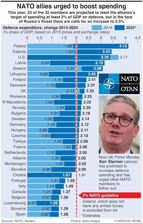 NATO members are currently committed to spending at least 2% of GDP on military expenditures, a target that around one-third of the alliance still doesn't meet, including Portugal (1.55%), Italy (1.49%), Canada (1.37%), Belgium (1.3%), and Spain (1.28%).