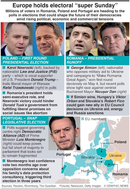 Millions of voters in Romania, Poland, and Portugal are heading to the polls in elections that could shape the future of their democracies amid rising political, economic, and commercial tensions.