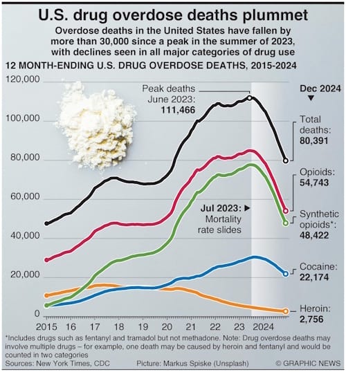 Overdose deaths in the United States have fallen by more than 30,000 since a peak in the summer of 2023, with declines seen in all major categories of drug use.