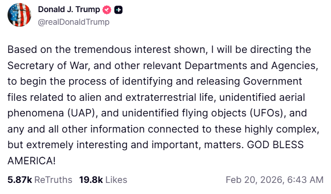 In a Truth Social post, Trump said the move responds to strong public interest in unidentified aerial phenomena, also known as UAPs. He said agencies would identify and release relevant files, though no timeline or details were provided.