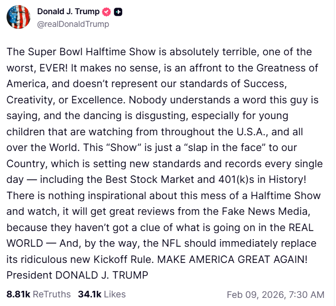 Posting on Truth Social, Trump objected to the Spanish-language lyrics and choreography, saying viewers could not understand the performance and calling it inappropriate for children. He also described the show as disrespectful to the country.