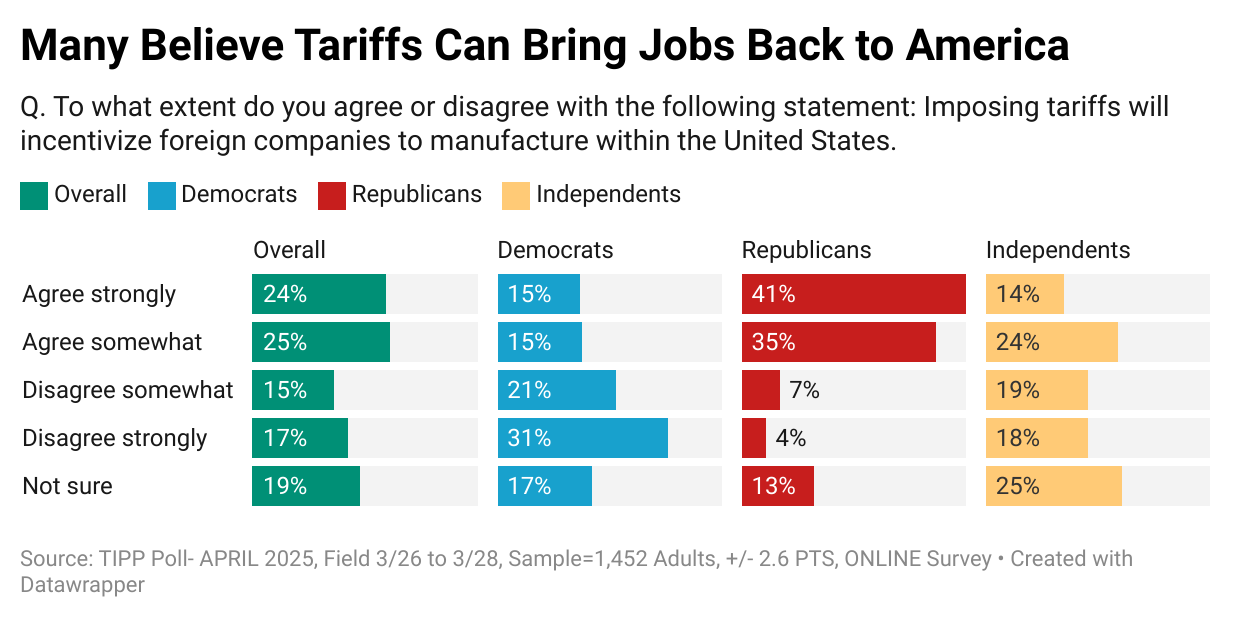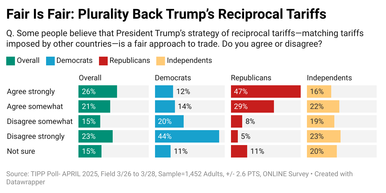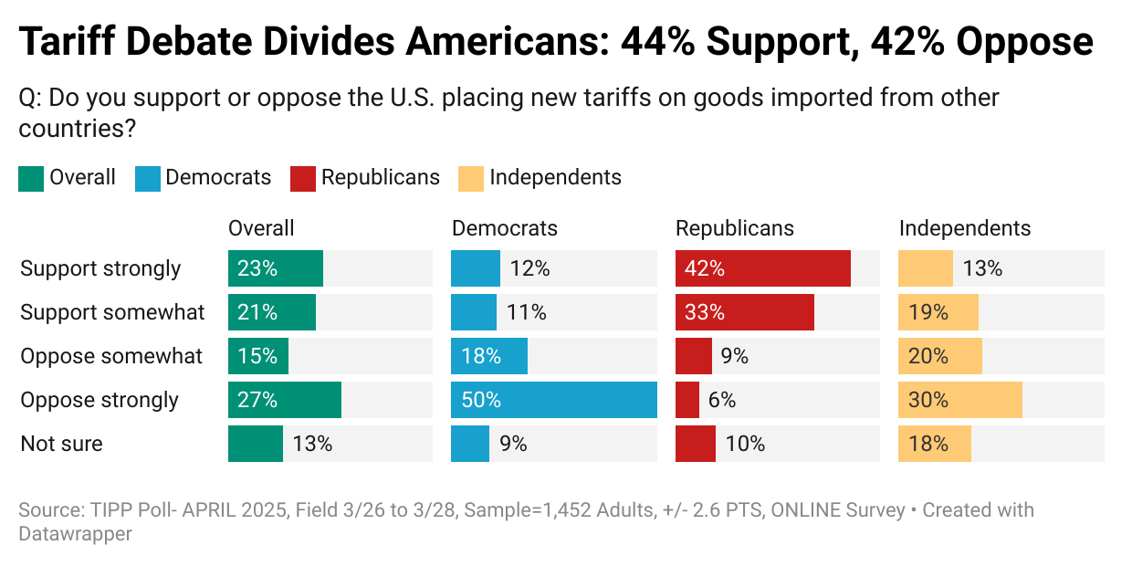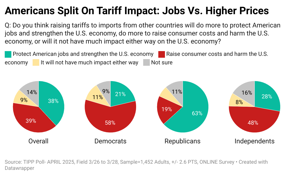 Right now, it's clear Americans are split on tariffs, mostly along political lines, as the I&I/TIPP Poll data show.